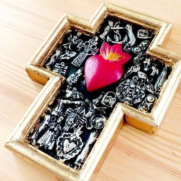 メキシコのミラグロ(ミラクル=奇跡)という名のお守りがついた、アンティーク調に作られた十字架の壁飾り。