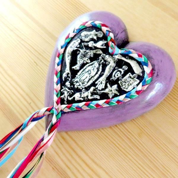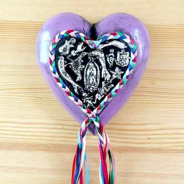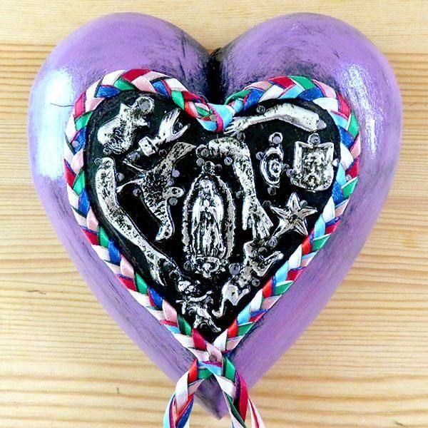 メキシコ 壁飾り ハート ミラグロ リボン マリア(パープル)[14cm]