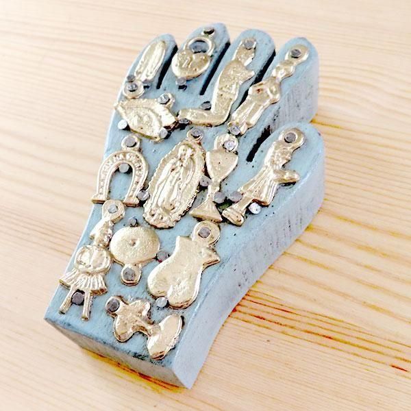 メキシコのミラグロ(ミラクル=奇跡)という名のお守りがついた、アンティーク調に作られた手がモチーフの壁飾り。