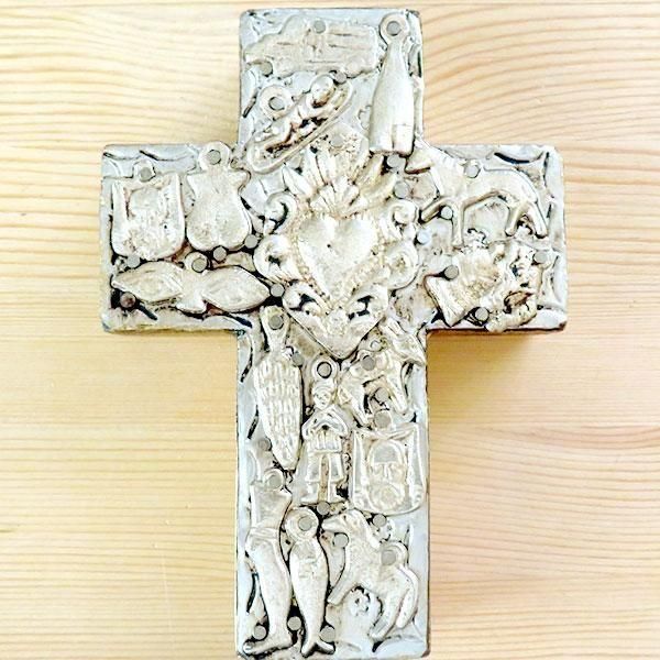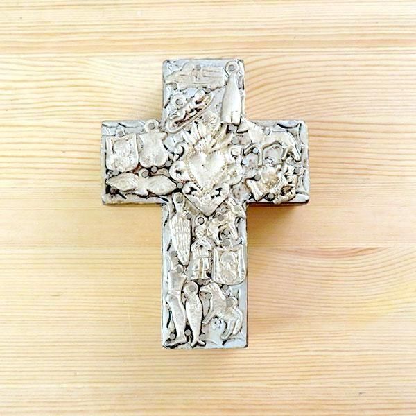 メキシコのミラグロ(ミラクル=奇跡)という名のお守りがついた、アンティーク調に作られた十字架の壁飾り。