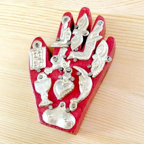 メキシコで作られた、ミラグロ(ミラクル=奇跡)という名のお守りがついた手をモチーフにした壁飾り。