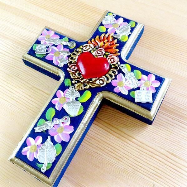 メキシコで作られた、ミラグロ(ミラクル=奇跡)という名のお守りがついた十字架の壁飾り。