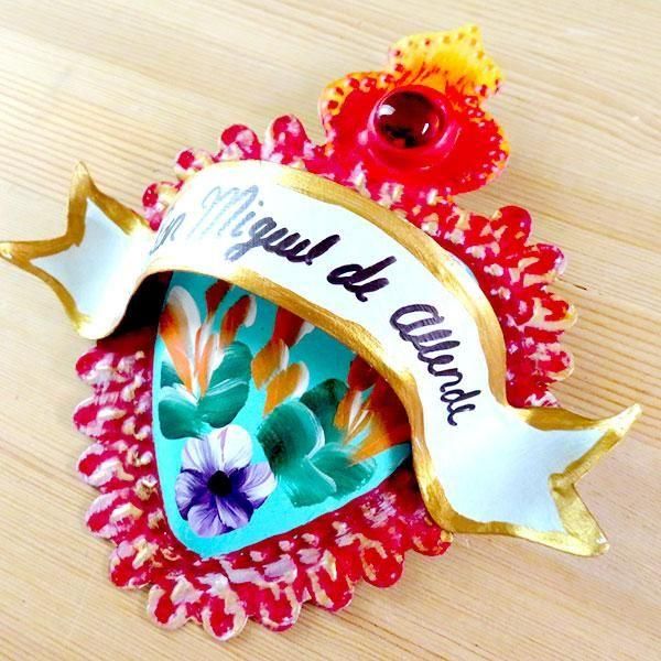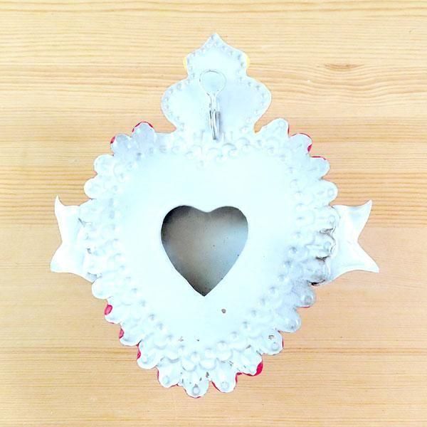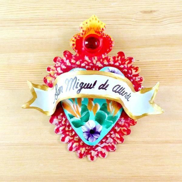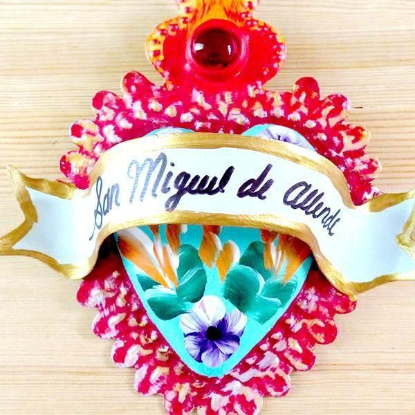 メキシコのカラフルな色合いのハート型ブリキオーナメント。