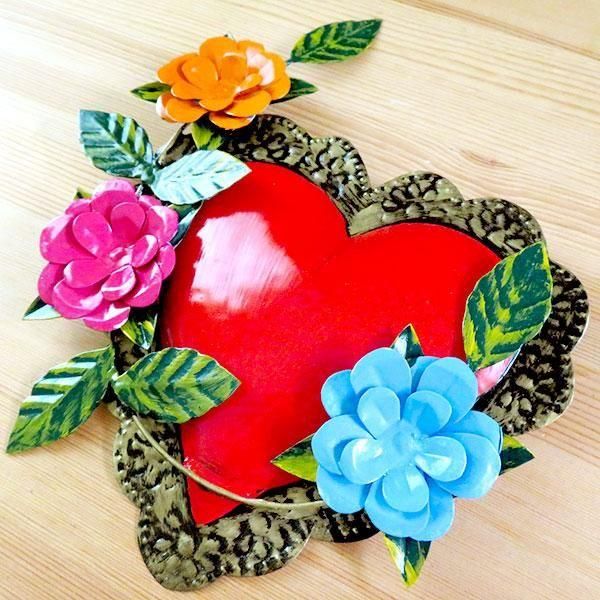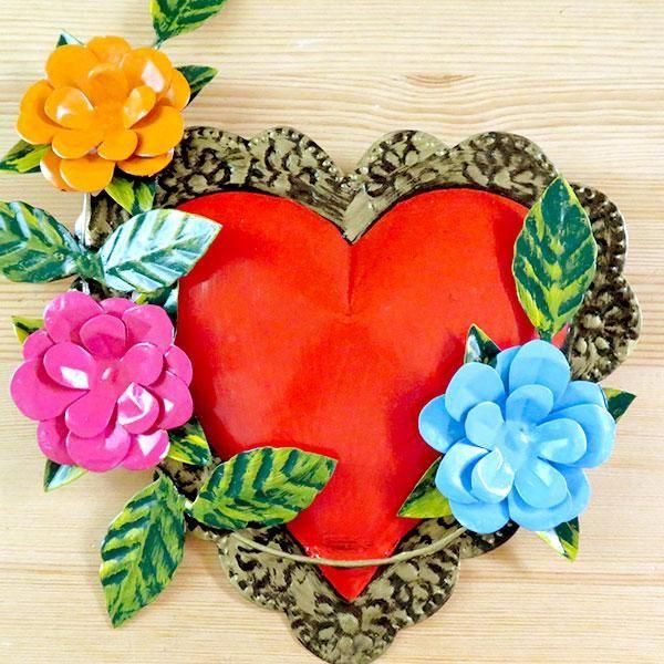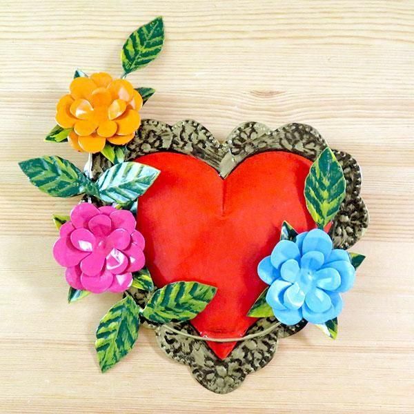 メキシコ ブリキオーナメント ハート フラワーL(レッド)[22cm]