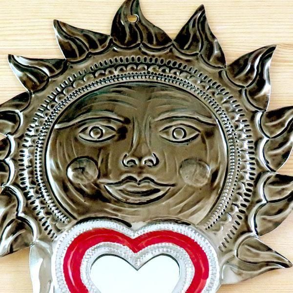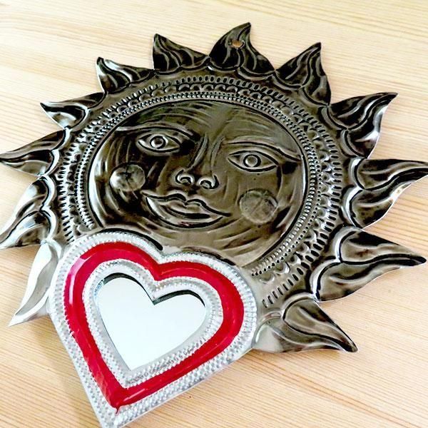 メキシコオアハカ州で有名なブリキアートの太陽とハートがモチーフの壁掛けミラーのMサイズです。