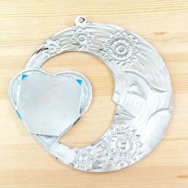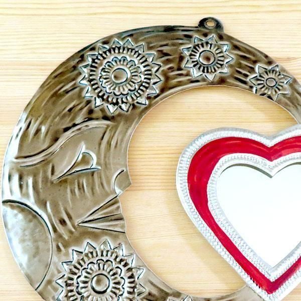 メキシコオアハカ州で有名なブリキアートの月とハートがモチーフの壁掛けミラーのMLサイズです。