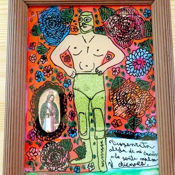 メキシコプロレス「ルチャ・リブレ」とグアダルーペの聖母マリア様の写真のまわりにガラスに直接お花などの絵を描き、コラージュして作られています。